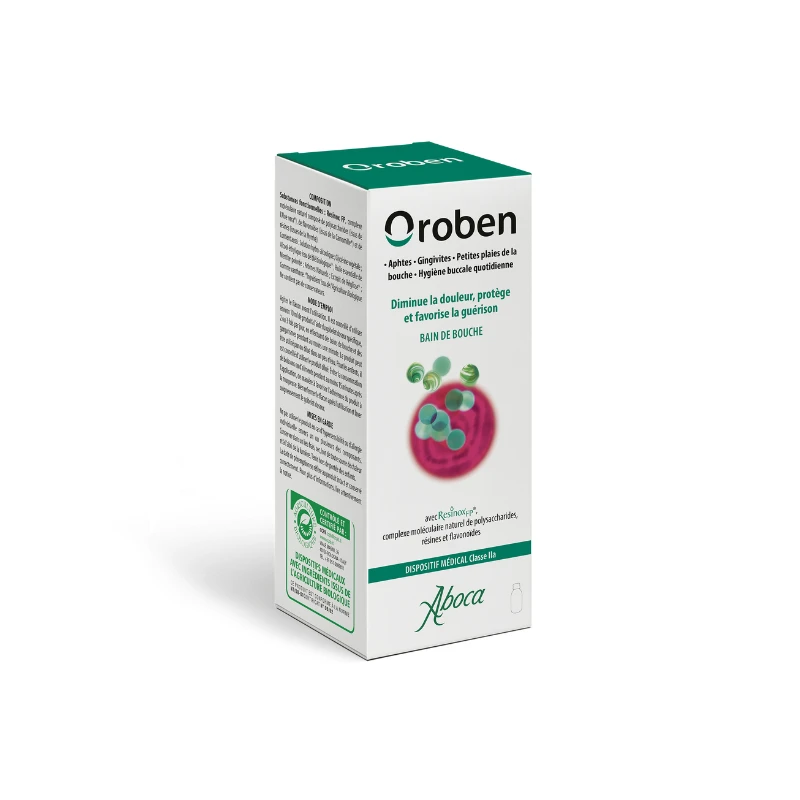 OROBEN BAIN DE BOUCHE 150ML ABOCA diminue la douleur, protège et favorise la guérison des aphtes, des stomatites aphteuses récurrentes, des gencives enflammées et des petites lésions buccales dues, par exemple, à des traitements dentaires ou à l’utilisation d’appareils orthodontiques et de dentiers