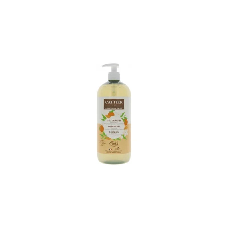 Cattier Gel Douche Aloe Vera Clémentine Fleur d’Oranger Bio 1 L est un gel douche formulé sans sulfate* et sans savon. Il nettoie délicatement et préserve l’équilibre naturel de la peau. L’aloe vera, aux multiples vertus, apporte confort et souplesse et contribue à protéger l’épiderme pour un véritable moment de bien-être.