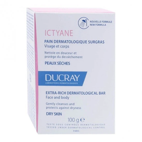 Le pain dermatologique surgras ICTYANE, nettoie la peau sans l’agresser et prévient le desséchement cutané.