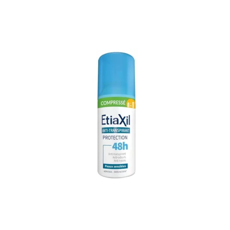Etiaxil Anti-Transpirant Protection 48H Peaux Sensibles Aérosol Compressé 100 ml est un aérosol anti-transpirant pour peaux sensibles à la formule enrichie en actifs déodorants et anti-transpirants. Il assure une efficacité de 48 heures contre les mauvaises odeurs et l’humidité.