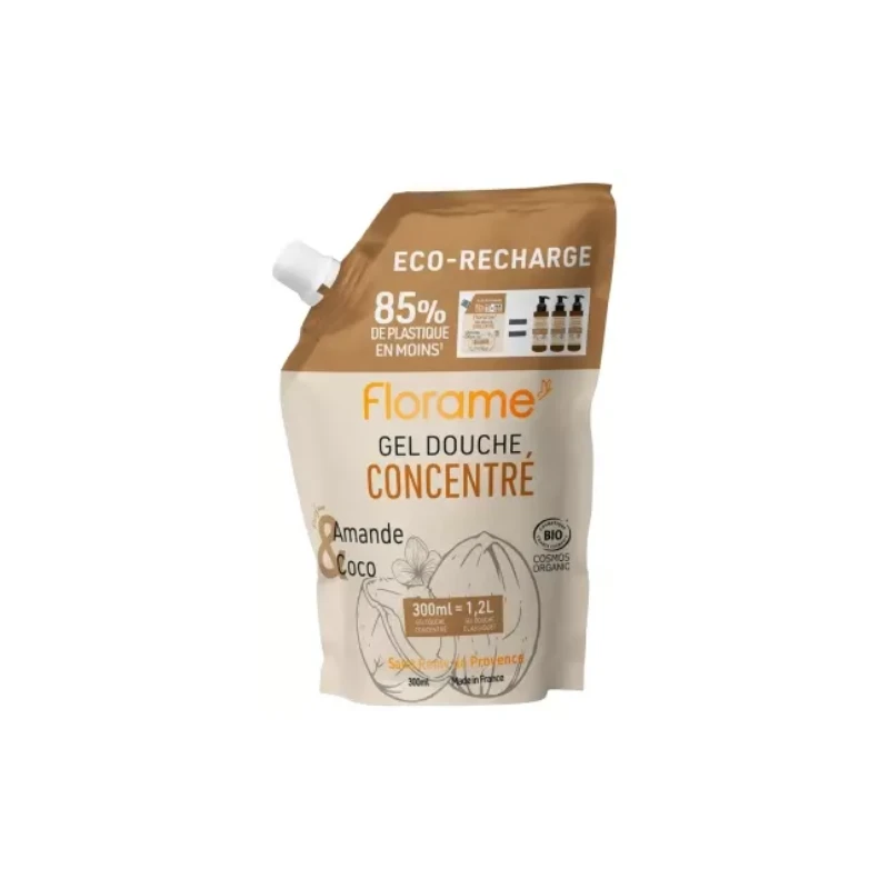 Florame Gel Douche Concentré Amande et Coco Éco-Recharge Bio 300 ml est un gel douche rechargeable à la formule concentrée : 1 pression = 1 douche. Ainsi, il permet de prendre le même nombre de douches qu’un gel douche de 1,2l, soit 150 douches.