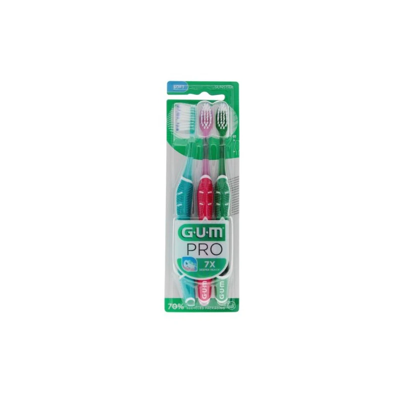 La brosse à dents souple PRO Gum est un lot de 3 brosses à dents, dont les brins médium (20/100ème) et brins ultra fins effilés (1/100ème) permettent un nettoyage en profondeur des dents et des gencives en s’insérant 7 fois plus profondément dans le sillon gingival.